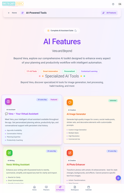 Access your entire planner library anytime, anywhere—on desktop, tablet, or mobile. Inside the app, you’ll also unlock powerful AI tools designed to make life easier, including: