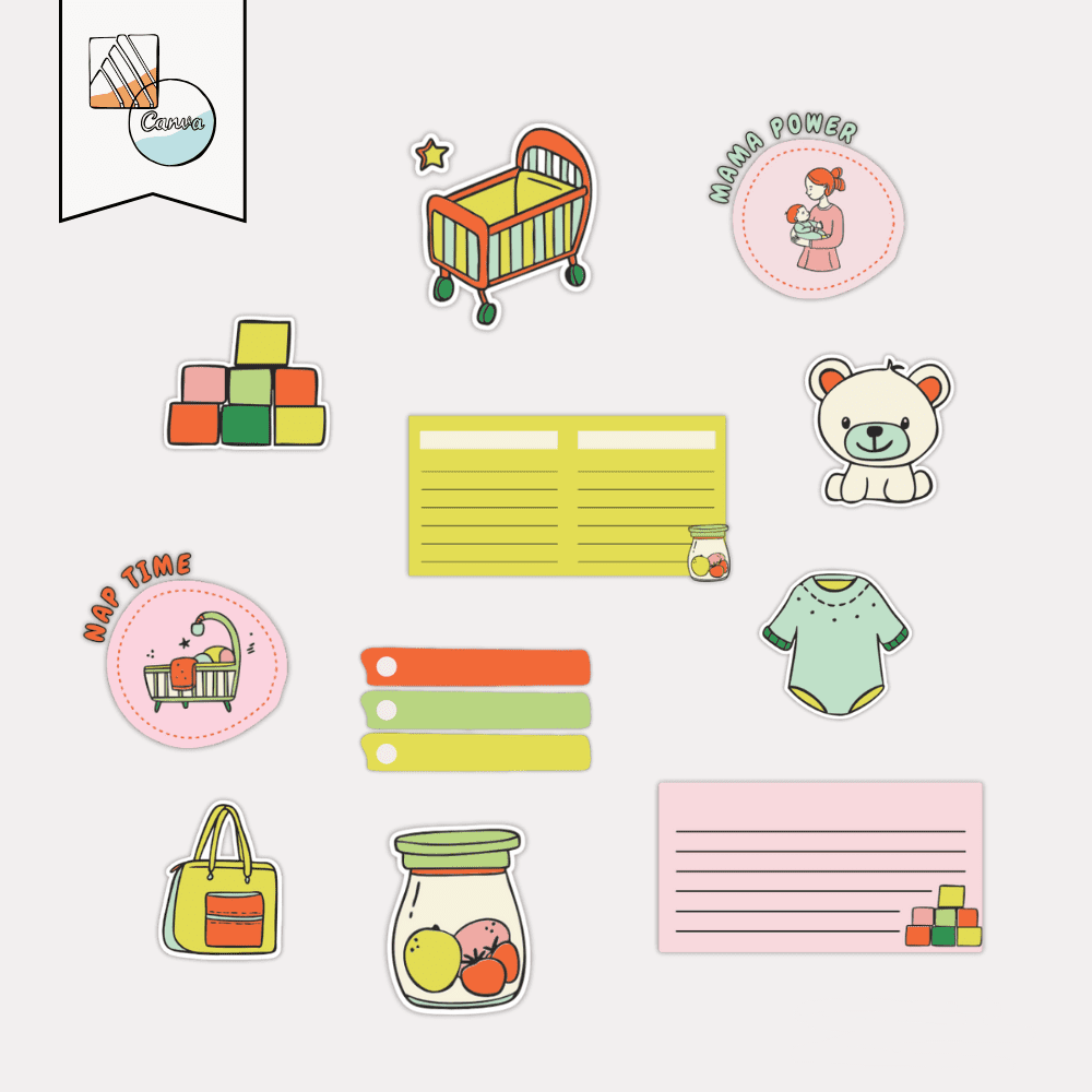 Add sweetness to your planning with this 12‑piece sticker set for new mums. Features baby blocks, onesies, nap time badges, notes boxes and more — perfect for journals, memory books and weekly spreads.